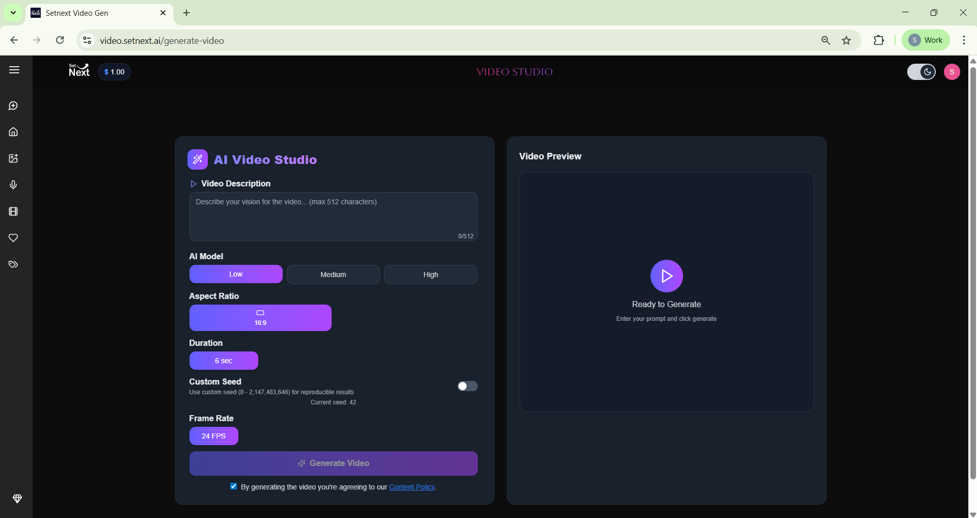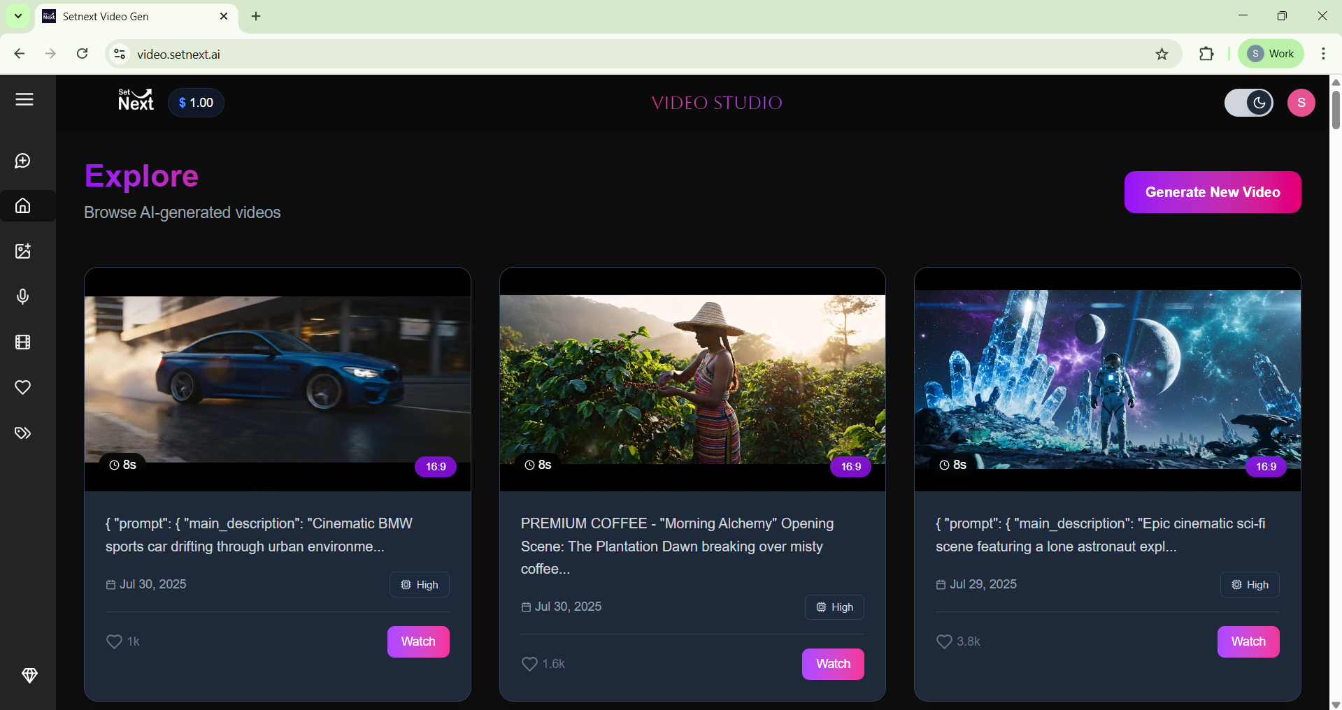 The Generate Video page allows you to transform your ideas into high-quality AI-generated videos. Simply describe the scene, set your preferences, and let the AI create cinematic content for you.